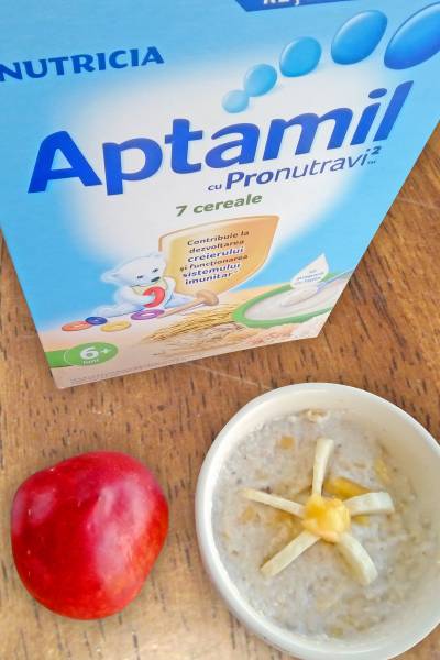 1. Mai întâi de toate vă propunem să pregătiți cerealele formulă de la Aptamil. În 200 ml lapte de mamă sau lapte formulă (călduț) adăugați circa 4 lingurițe de cereale.